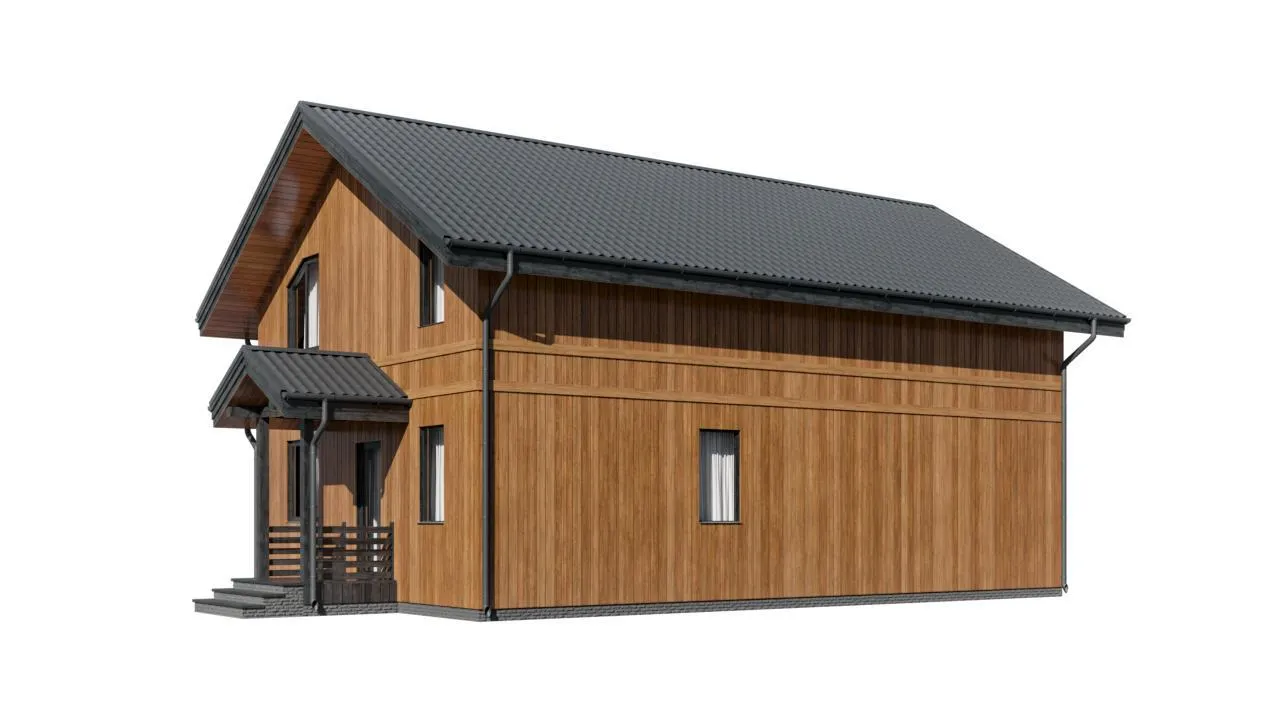 Дом из бруса проект Д-7 - оптимальный вариант для загородного участка. Он имеет этажность: 1,5 этажа и размеры 8х12 м., что позволит построить его практически на любой территории.